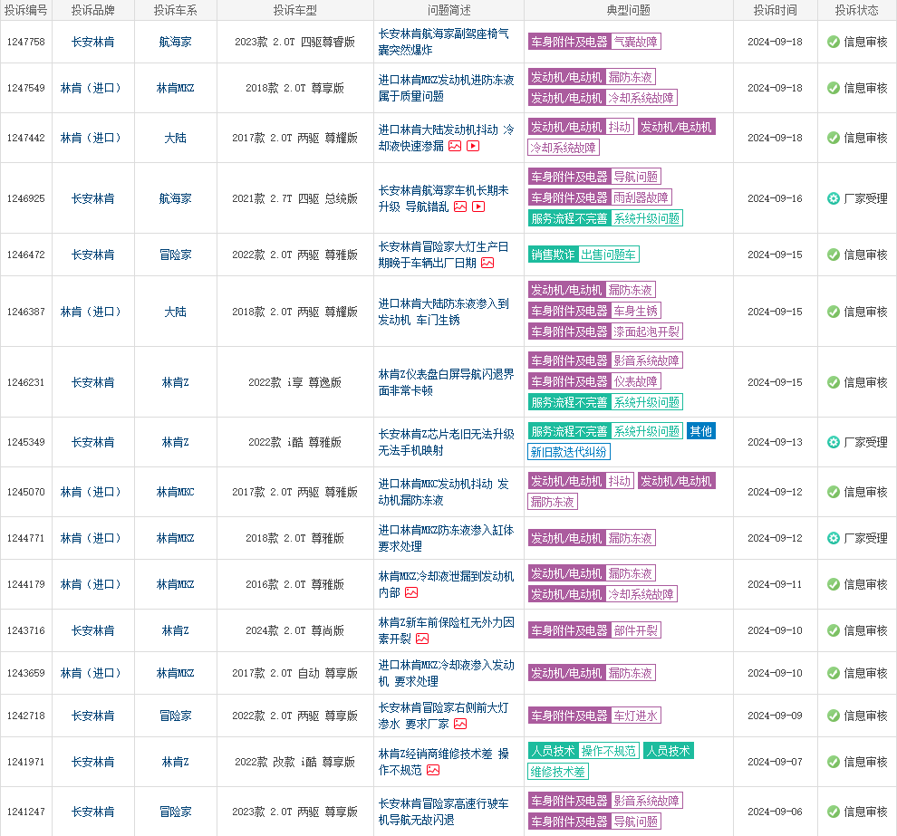 如果说减配对于林肯来说是“远虑”,那林肯的“近忧”无疑是产品质量。被投诉的问题也是五花八门,小的有座椅故障、油箱异响、天窗漏水,大的有发动机抖动、动力消失、变速器顿挫、变速器跳档、转向系统卡滞等,问题多到你不敢相信这是一个动辄卖30多万的豪华品牌。