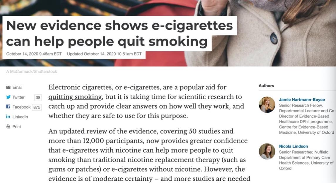 最新一项涵盖50项研究和超过1.2万名参与者的例证回顾为电子烟增强了信心,该研究认为相比于传统的尼古丁替代疗法(如口香糖或贴剂)和不含尼古丁的电子烟,尼古丁电子烟能帮助更多人戒烟。且该综述未发现任何证据表明尼古丁电子烟存在严重危害。