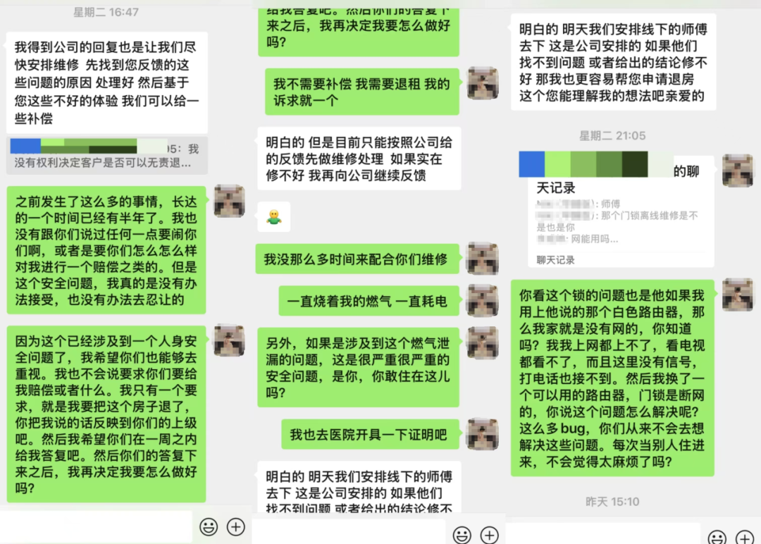 据吴女士自述,事情的起因是,半年前在自如曼舍租了一套一居室,房租每月2万元,押金3.8万元押二付一,入住后因房屋质量问题维修了几十次,空调地暖报修很多次,客服都没有处理好,几天前开启冬天地暖,管道没接好导致燃气泄漏,造成一氧化碳中毒进了医院。