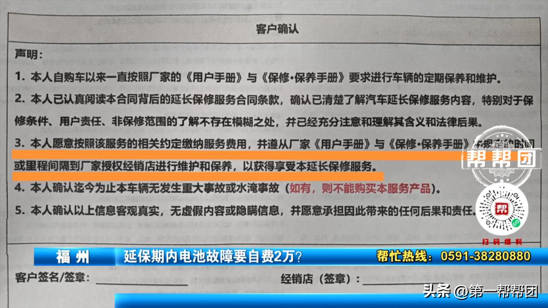 林经理向记者出示了《汽车延长保修服务合同》,其中“客户确认”栏第三条载明:“本人自愿遵从厂家《用户手册》与《保修保养手册》中规定的时间或里程间隔,到厂家授权经销店进行维护保养,方可享受本延长保修服务”。但林女士强调,签约时仅签署了姓名,未收到合同原件,也未被告知该条款内容。