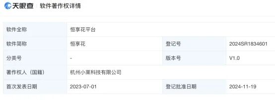 工商信息显示,恒享花平台的软件著作权归属杭州小莱科技,登记版本v1.0,2024年11月完成。