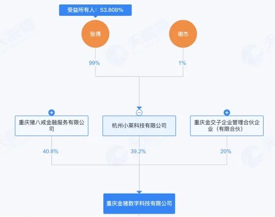 股权信息显示,2024年6月,杭州小莱科技和重庆猪八戒金融服务有限公司(简称“猪八戒金服”)、重庆金交子企业管理合伙企业(有限合伙)合资成立重庆金猪数字科技有限公司(简称“金猪数科”),杭州小莱科技持股39.2%,猪八戒金服持股40.8%,张博任金猪数科的法定代表人,也是杭州小莱科技的最终受益人,最终受益股份53.8%。