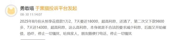 除了强制下款、多下款问题,恒享花最大的莫过于高炮高利贷问题。有一名网友在黑猫投诉上称, 8月3号在恒享花平台借了3300元,逾期14天要还33000多元,“这个就是高炮”。另有网友在黑猫投诉上称,8月在恒享花借款12000元,7天要还18000元,七天利率为50%,折合成年化利率达到2600%。