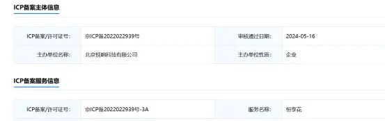 恒享花APP的运营主体为北京悦响科技有限公司,ICP备案显示也为悦响科技。
