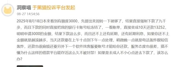 除了强制下款,恒享花还存在多下款的问题。有网友在黑猫投诉上称,8月18日本来看到有额度3000,先提出来周转一下,结果直接强制下款9000多元,账单显示10天还款13252元,年化利率达到1700%。