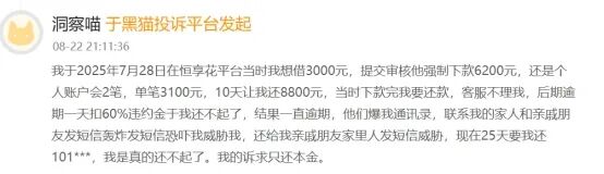 有网友称,自己在恒享花申请借款3000元,提交审核平台强制下款6200元,个人账户两笔,单笔3100元,10天要求还8800元,后期逾期一天扣60%违约金。“我还不起了,结果一直逾期,他们爆我通讯录,各种暴力催收。”