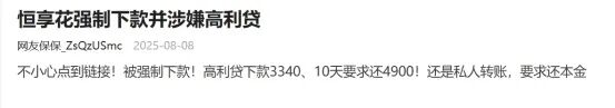 在消费保平台,有多位网友也提到自己遭遇恒享花强制下款的经历。有网友称,自己不小心点到链接,被强制下款,下款3340元、10天要求还4900元,还是私人转账,实属是高利贷。经计算,其贷款年化利率达到1680%。