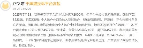 另一名网友遭遇了同样的情况,据其自述称:7月28日,我在恒享花平台原本计划借款2000元,平台未经过我明确同意强制下款3223元,款项通过个人账户分两次转入我的账户,疑似规避监管。还款时平台未通过自身官方渠道,而是通过密信要求我向个人账户支付宝转账还款,流程不规范且存在风险。 “经计算,借款3223元仅10天,需还款4577元,属于高利贷,年化利率达到1533%。”