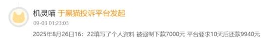 一名金融消费者称,8月26日在恒享花上填写了个人资料,被强制下款7000元,平台要求10天后还款9940元,粗略计算贷款年化利率达到1500%。