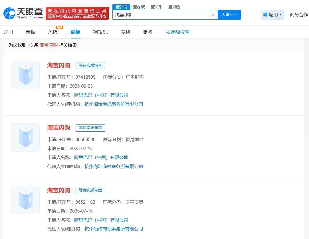 今年以来,阿里巴巴(中国)有限公司已申请注册多枚“淘宝闪购”“淘宝闪购 点外卖更优惠”商标,国际分类包括广告销售、网站服务、健身器材等,其中部分商标状态为初审公告。