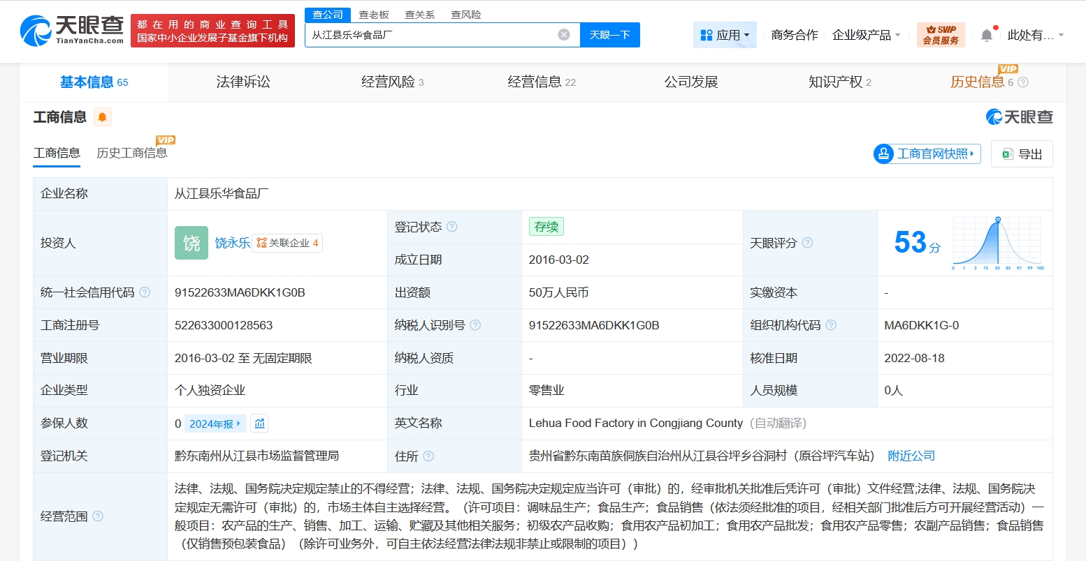 天眼查App显示,从江县乐华食品厂成立于2016年3月,为饶永乐个人独资企业,出资额50万人民币,经营范围含调味品生产,食品生产,食品销售,农产品的生产、销售、加工、运输、贮藏及其他相关服务,初级农产品收购,食用农产品初加工等。天眼风险信息显示,2023年12月,该食品厂因生产的辣椒面未按规定标注营养成分,被罚1000元。此外,2023年9月,该食品厂因产品标签与实物不符,被罚3000元并没收违法所得。