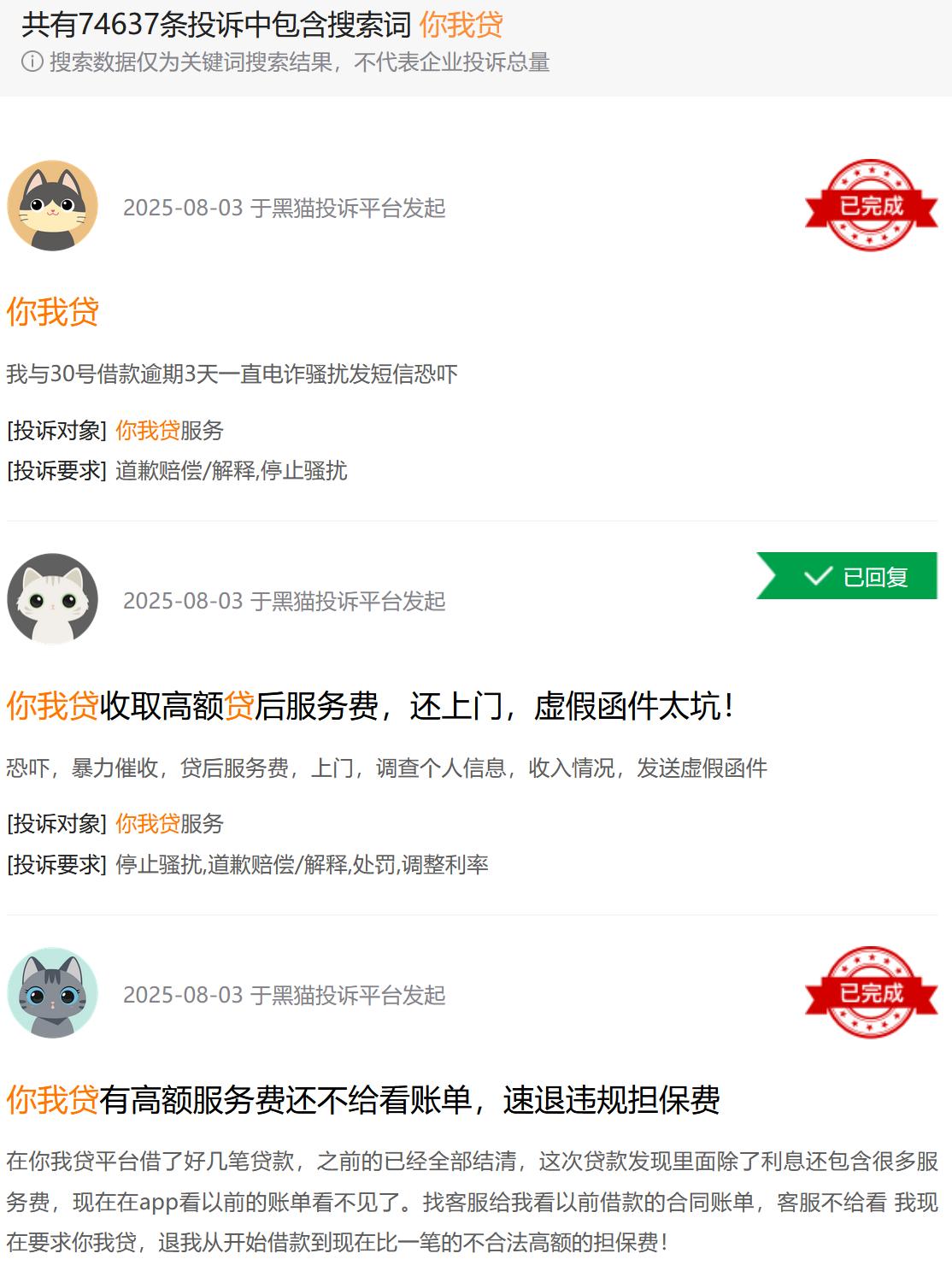 截至2025年9月1日,黑猫投诉平台显示,以“你我贷”为关键词的相关搜索结果高达74637条、“极融”24669条,合计近10万条。