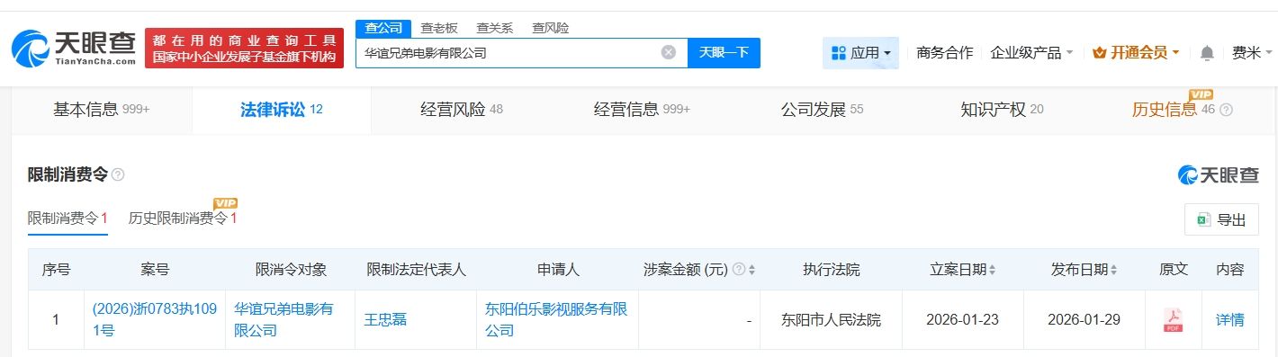 天眼查法律诉讼信息显示,近日,华谊兄弟电影有限公司及其法定代表人王忠磊(王中磊)新增一则限制消费令,执行法院为东阳市人民法院。案件流程信息显示,此前,该公司已因此案被执行599万余元。