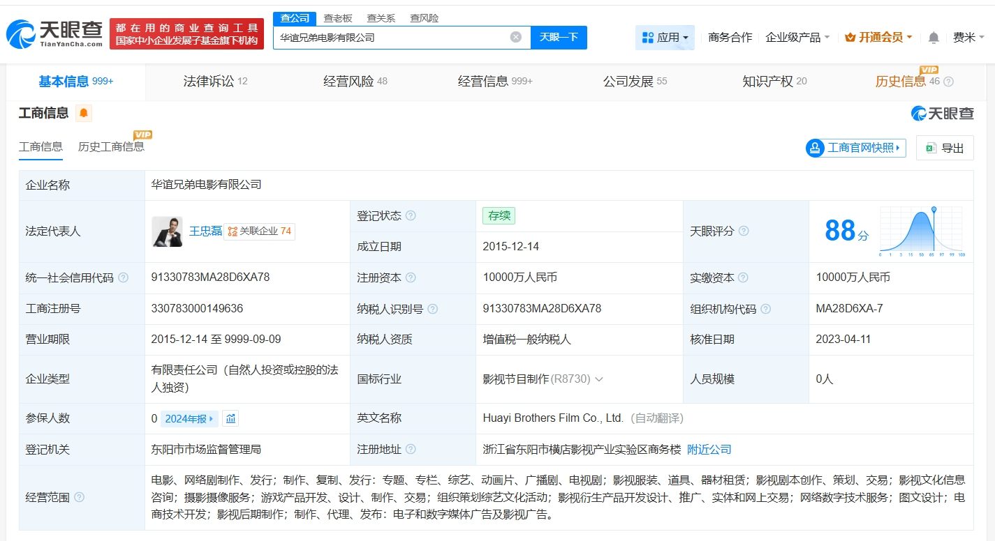 华谊兄弟电影有限公司成立于2015年12月,注册资本1亿人民币,经营范围包括图文设计、电商技术开发、影视后期制作等。股东信息显示,该公司由华谊兄弟(300027)全资持股。