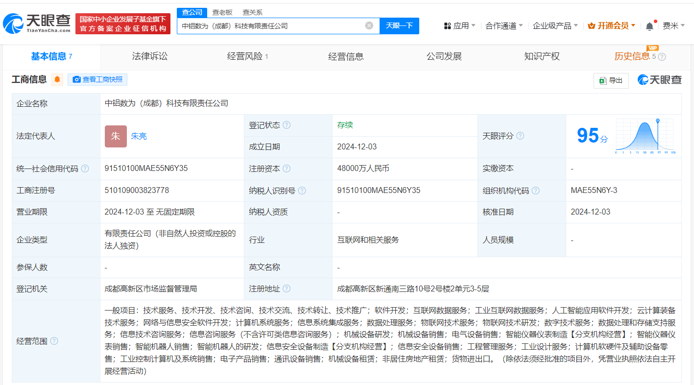 天眼查App显示,近日,中铝数为(成都)科技有限责任公司成立,法定代表人为朱亮,注册资本4.8亿人民币,经营范围含工业互联网数据服务、人工智能应用软件开发、云计算装备技术服务、网络与信息安全软件开发、智能机器人销售、智能机器人的研发等,由中国铝业集团有限公司全资持股。