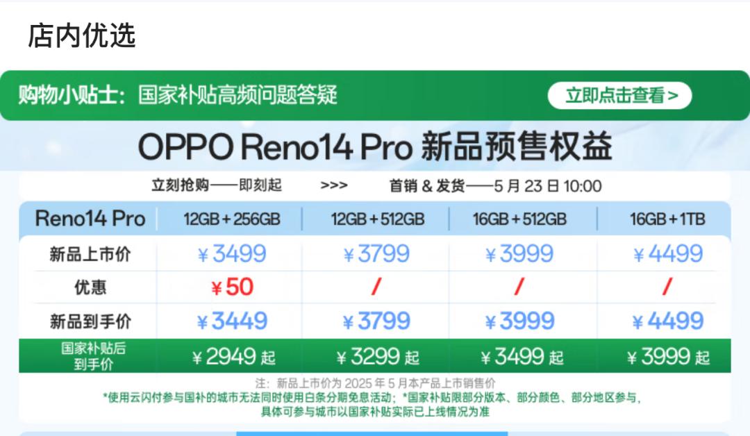 此外,OPPO Reno14 Pro 12GB+256GB的官方售价为3499元,12GB+512GB售价为3799元,16GB+512GB售价3999元,16GB+1TB售价4499元。在OPPO京东自营旗舰店,这四个配置的Reno14 Pro领取“国补”和平台优惠后的售价为2949元、3299元、3499元和3999元。