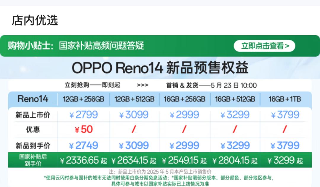 以前不久OPPO发布的Reno14系列为例,5月15日,OPPO正式发布Reno14系列手机,其中,OPPO Reno14系列12GB+256GB版本的官方售价为2799元,16GB+256GB版本2999元,12GB+512GB版本售价3099元,16GB+512GB为3299元,16GB+1TB为3799元。