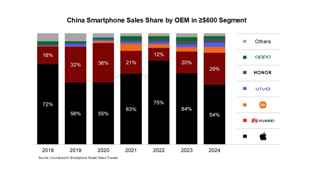 根据Counterpoint于今年3月发布的《智能手机型号销量追踪报告》,在2024年中国600美元手机以上市场份额榜单中,苹果以54%份额排在第一位;华为排名第二,占据29%的份额。