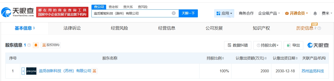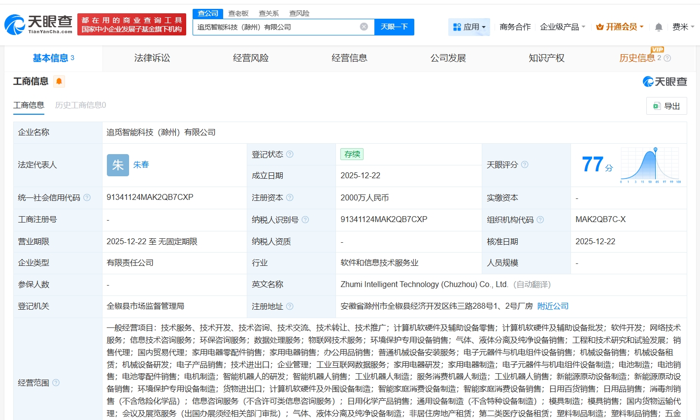 天眼查App显示,近日,追觅智能科技(滁州)有限公司成立,法定代表人为朱春,注册资本2000万人民币。经营范围包括智能机器人的研发、智能机器人销售、工业机器人制造等,由追觅创新科技(苏州)有限公司全资持股。