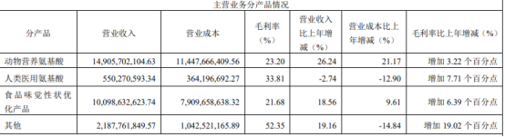 其中食品味觉性状优化产品毛利率较上年同期增加6.39%,动物营养氨基酸产品毛利率较上年同期增加3.32%,人类医用氨基酸产品毛利率较上年同期增加7.71%,还有其他产品毛利率增加了19.02%。