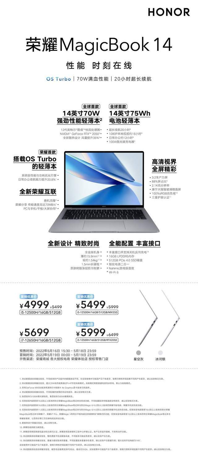 全新荣耀MagicBook 14在性能、续航、设计、互联、安全、服务等方面带来了全面升级的体验,全系搭载第12代智能英特尔®酷睿™ 标压处理器,最高搭载NVDIA® GeForce RTXTM 2050光追独显,是全球首款14英寸70W强劲性能轻薄本,也是全球首款14英寸搭载75Wh超大容量电池的轻薄本。全新荣耀MagicBook 14 售价5499元起,首销优惠价4999元起,于5月16日起在荣耀商城、各大授权电商、荣耀体验店、授权零售门店正式开启预售,5月19日00:00正式开售。