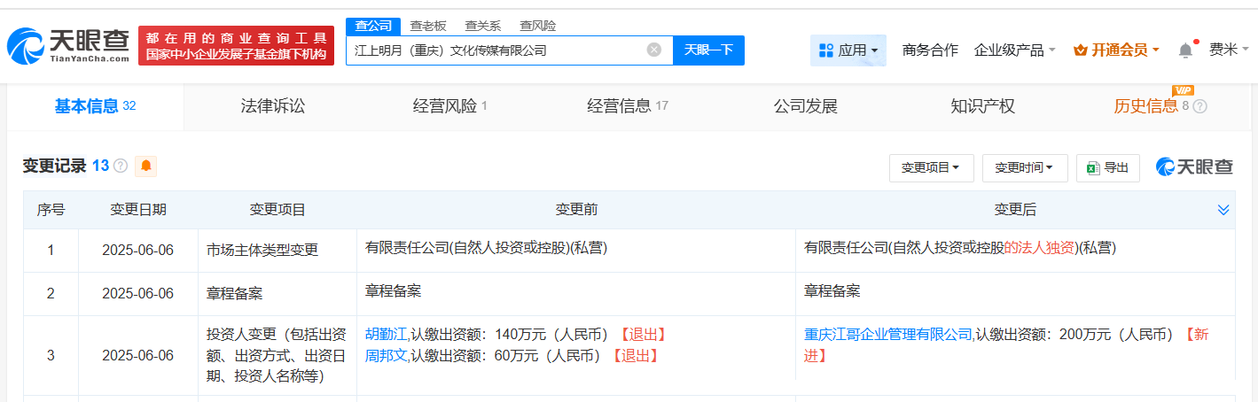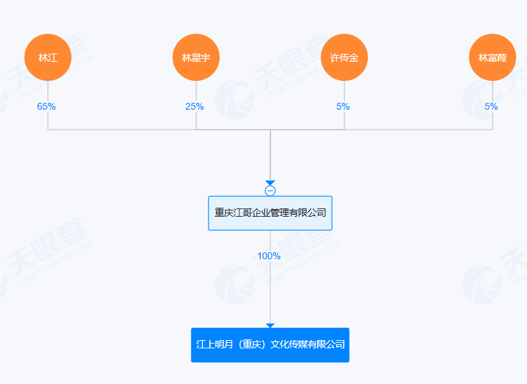 该公司成立于2023年1月,法定代表人为许传金,注册资本200万人民币,经营范围包括网络文化经营、互联网直播技术服务、演出经纪等。股权全景穿透图显示,该公司由重庆江哥企业管理有限公司全资持股,后者由林江(卤鹅哥)持股65%。变更记录显示,今年6月,重庆江哥企业管理有限公司全资入股该公司。