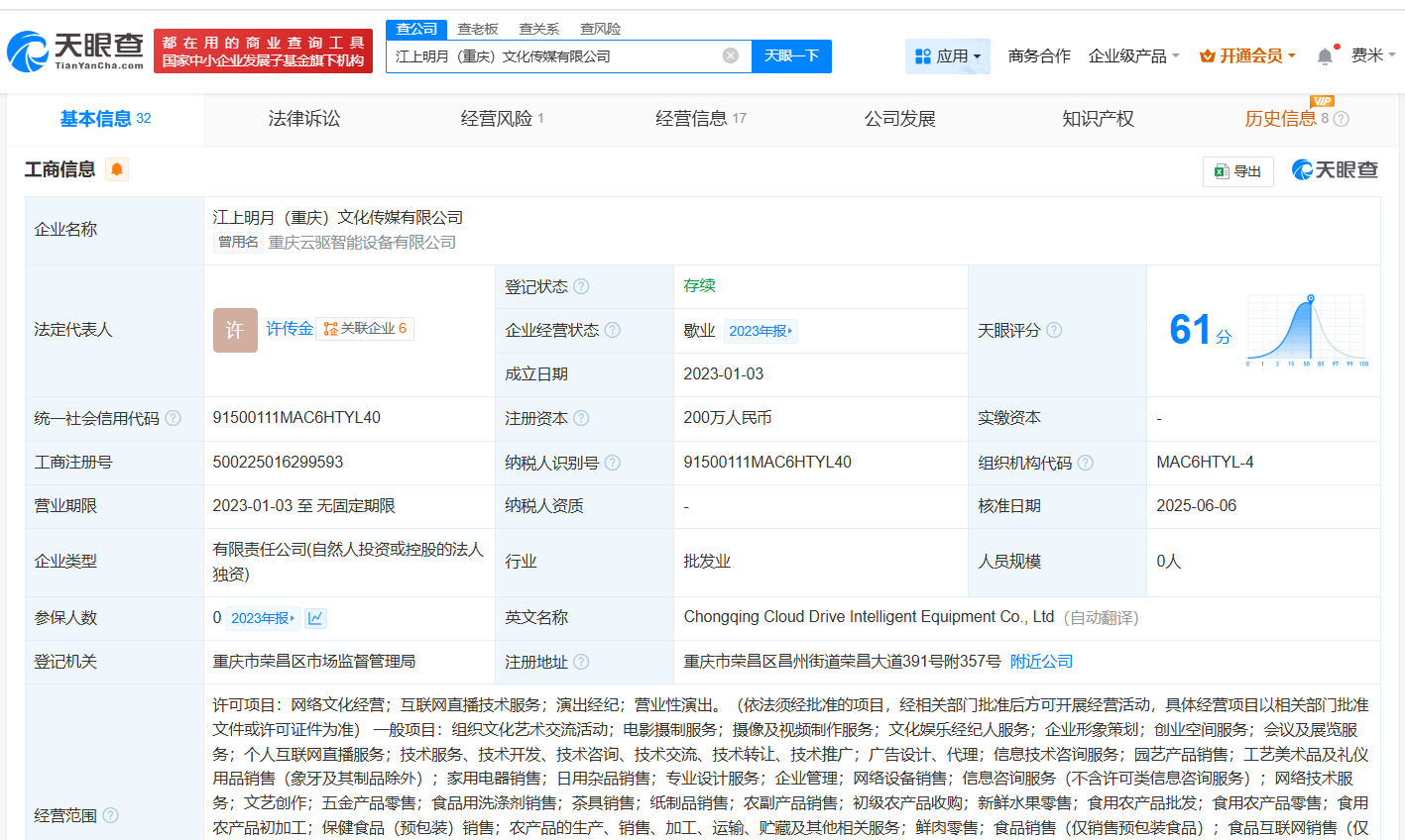 天眼查经营风险信息显示,近日,江上明月(重庆)文化传媒有限公司因未依照规定的期限公示年度报告,被重庆市荣昌区市场监督管理局列入经营异常名录。