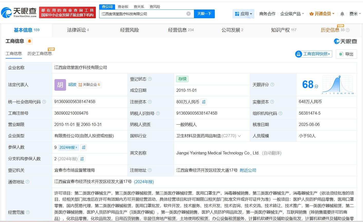 天眼查App显示,涉事公司江西宜信堂医疗科技有限公司成立于2010年11月,法定代表人为胡波,经营范围包括第二类医疗器械生产、第三类医疗器械租赁、第三类医疗器械经营等。股东信息显示,该公司由胡波、邬环共同持股。变更记录显示,去年8月,该公司注册资本由2000万人民币减至800万人民币。