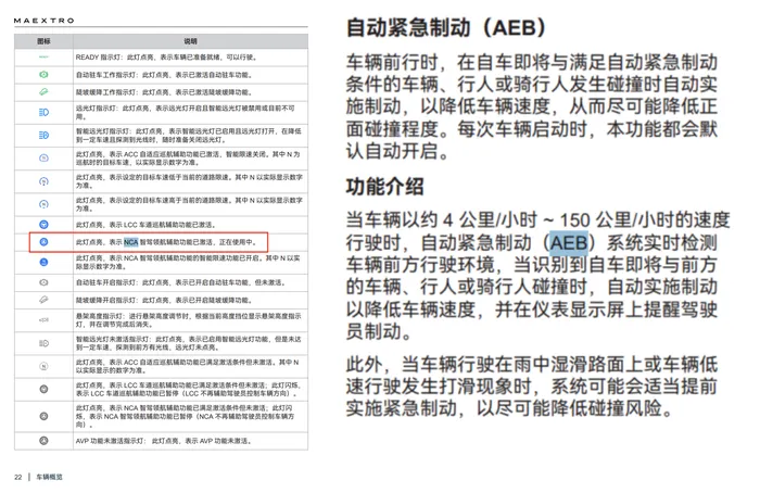 记者还查询了尊界汽车的说明书,NCA处于点亮状态表明“智驾领航辅助功能已激活”;AEB功能表明车辆在以约4公里/小时~150公里/小时的速度行驶时,当识别到自车即将与前方的车辆、行人或骑行人碰撞时,自动实施制动以降低车辆速度,并在仪表显示屏上提醒驾驶员制动。