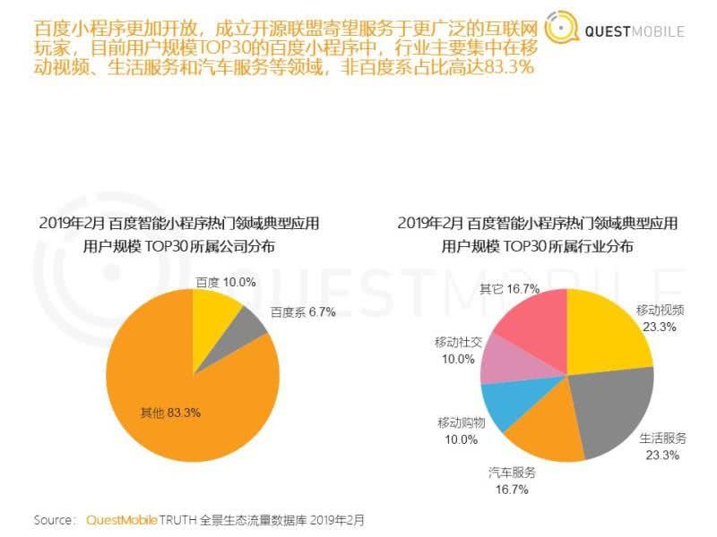 百度智能小程序在流量上虽然也有对贴吧、糯米、爱奇艺、百度视频这些亲儿子的扶持,但其对这些产品的流量扶持倾斜力度却远没有微信和支付宝对亲儿子们来得那么猛烈。百度对他们的流量扶持最高的也没有超过30%。百度在流量扶持上,倾斜力度更大的其实是非百度系产品。据QuestMobile公布的数据显示:目前用户规模TOP30的百度小程序中,行业主要集中在移动视频、生活服务和汽车服务等领域,非百度系占比高达83.3%。