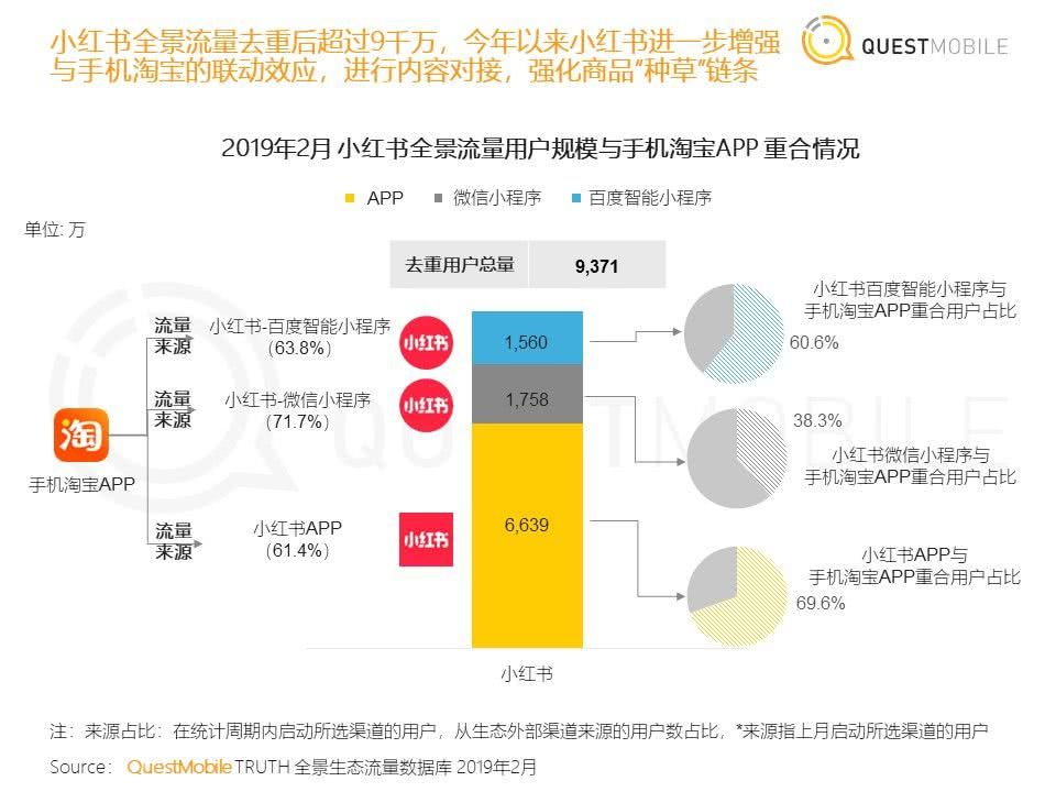 据QuestMobile数据显示:2019年2月,小红书全景流量去重后超过9千万,其中百度智能小程序为小红书带来的新增用户为1560万,约占小红书APP四分之一,这与微信小程序的1758万相差无几。其中小红书百度智能小程序与电商APP重合用户占比为60.6%,微信小程序的数据为38.3%,这意味着约有945.36万人通过小红书百度智能小程序进入电商APP,成为潜在消费人群;约有673.31万人通过小红书微信小程序进入电商App,成为潜在消费人群。