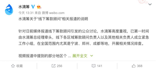 针对此事,水滴筹回应称,视频报道中提到的部分地区个别线下人员的违规现象,严重违反了水滴公司价值观、准则及相关规定,调查清楚后将给以严惩。目前,公司已成立紧急工作小组,在全国范围内尤其是宁波、郑州、成都等地,开展相关情况排查。水滴筹表示,自即刻起,线下服务团队全面暂停服务,整顿彻查类似违规行为。