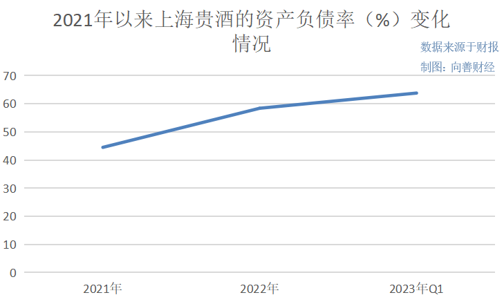 分析完上海贵酒的成长和盈利能力,再来看其资产负债和偿债能力,财报数据显示,2021年——2023年一季度,上海贵酒的资产负债率分别为44.5%、58.4%和63.8%,整体呈一路飙升之势,这无疑对其偿债能力形成了极大考验。
