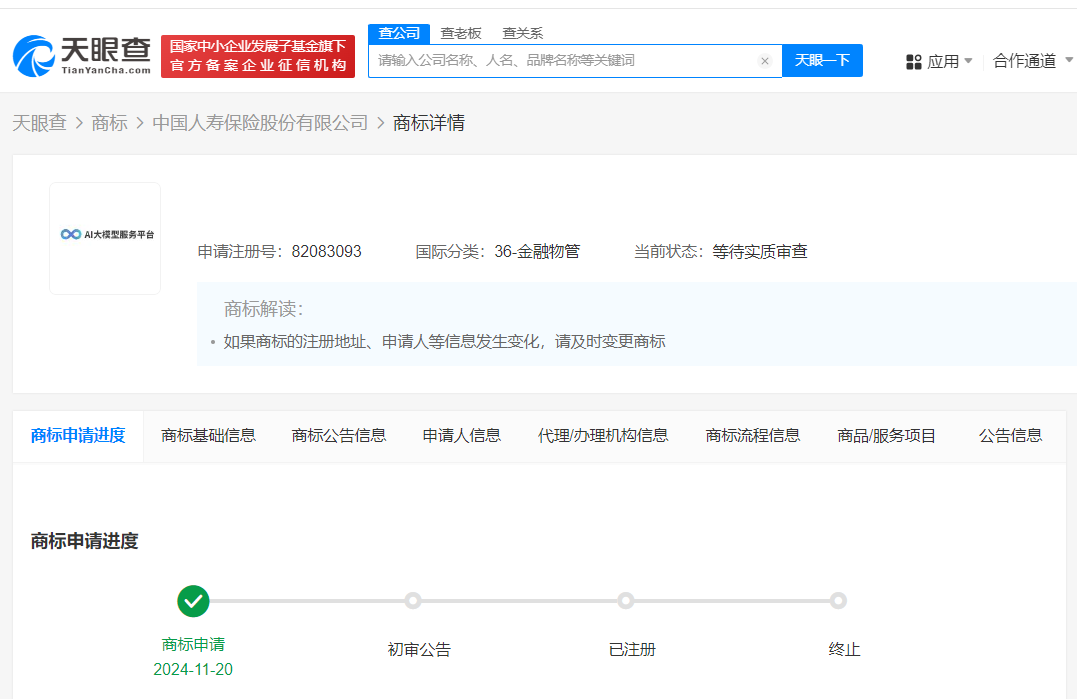 天眼查知识产权信息显示,近日,中国人寿(601628)申请注册一枚“AI大模型服务平台”商标,国际分类为金融物管,当前商标状态为等待实质审查。