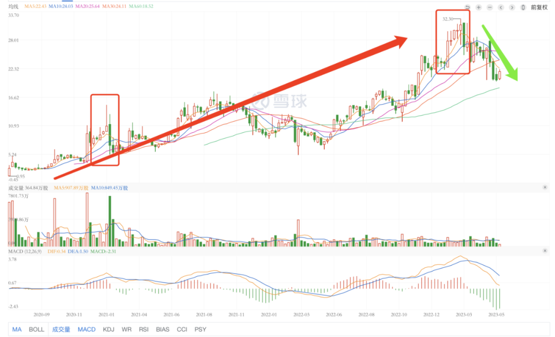 2023年5月1日,又是瑞幸的财报日,2023年Q1的数据也非常给力:2023年Q1,瑞幸营收44.4亿、同比增长84.5%;净利润5.65亿、同比增长2848%。但是,在如此靓丽的业绩公布后,瑞幸大跌超过38%,截至5月19日,瑞幸探至近期最低点20.05美元。