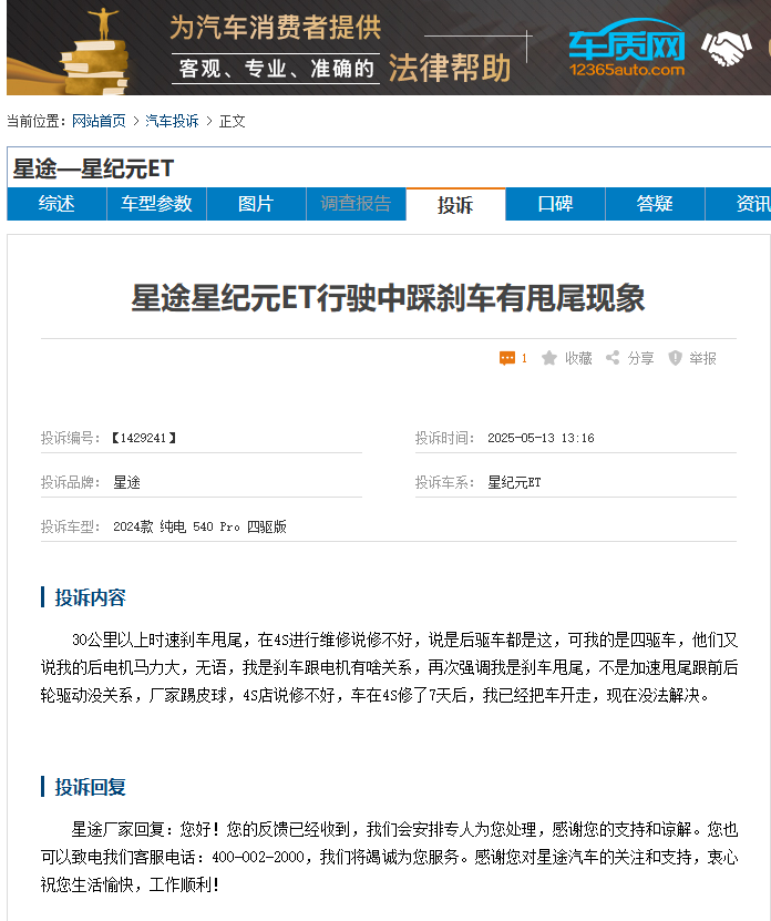 随后,记者从车质网上发现奇瑞星途星纪元ET刹车甩尾的同类投诉。投诉时间是今年5月13日,根据投诉内容显示,该车主购买的星图星纪元ET 2024款纯电540 Pro四驱版在30公里以上时速刹车甩尾,4s店给出解释是维修修不好,后驱车都是这样。