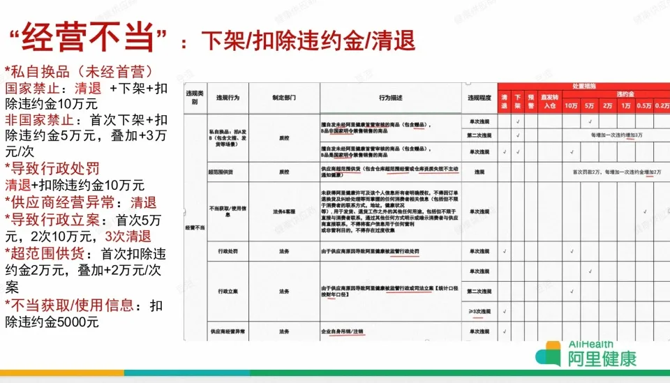 阿里健康供应商管理规则显示,若因供应商原因导致阿里健康被行政立案,将扣除供应商5万元违约金,若导致阿里健康被行政处罚,将直接清退供应商并扣除10万元违约金。