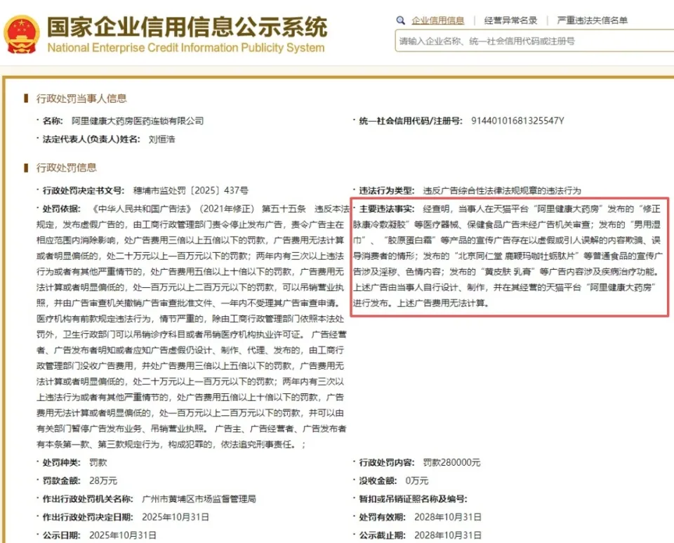 而据国家企业信用信息公示系统,就在2025年10月31日,阿里健康大药房医药连锁有限公司因设计、制作并发布未经审查的医疗器械、保健食品广告,及发布虚假误导广告,发布普通食品的宣传广告涉及淫秽、色情内容等,被罚款28万元。