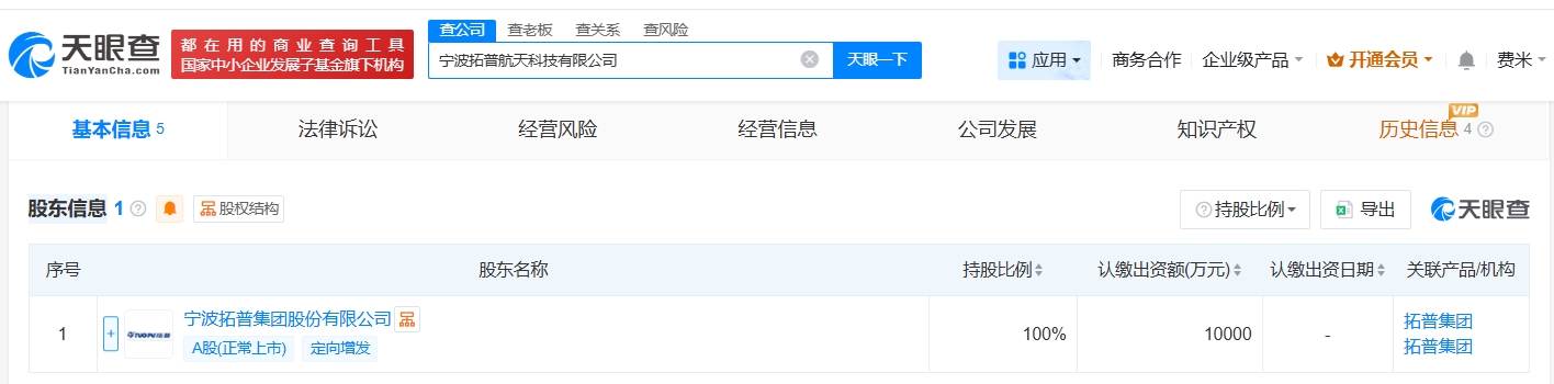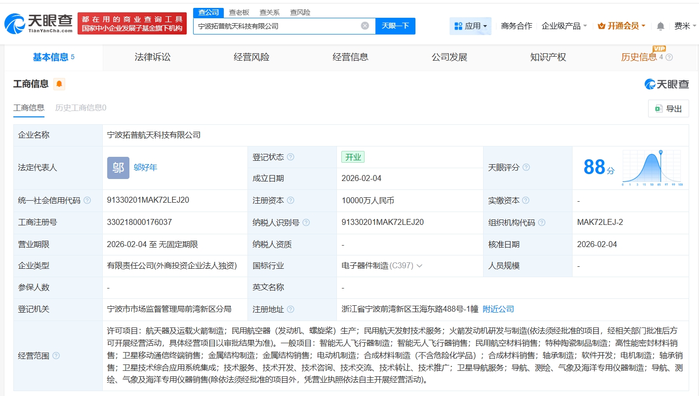 天眼查App显示,近日,宁波拓普航天科技有限公司成立,法定代表人为邬好年,注册资本1亿人民币,经营范围包括航天器及运载火箭制造、民用航空器生产、民用航天发射技术服务、火箭发动机研发与制造等。股东信息显示,该公司由拓普集团(601689)全资持股。