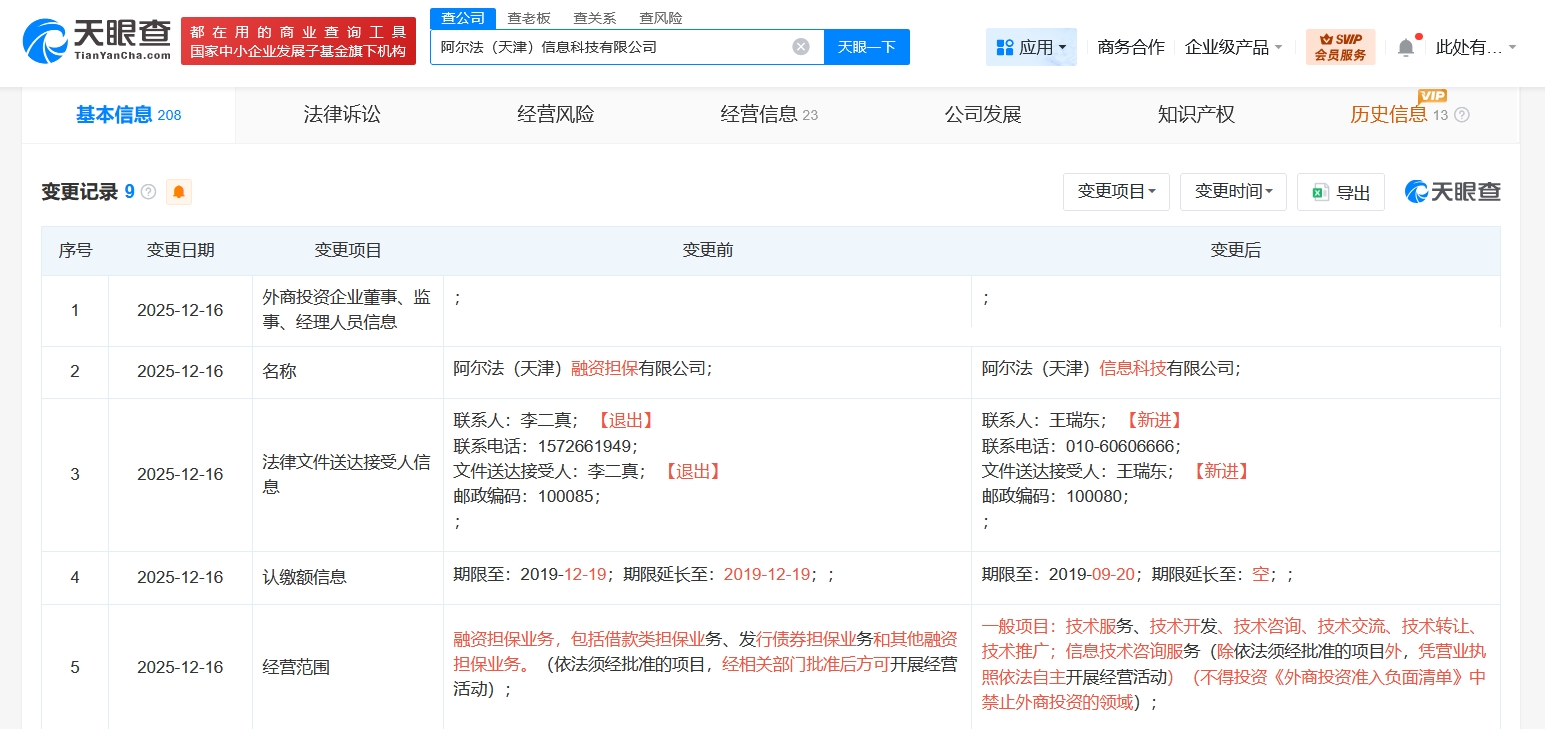 天眼查App显示,近日,阿尔法(天津)融资担保有限公司发生工商变更,企业名称变更为阿尔法(天津)信息科技有限公司,同时,经营范围由融资担保业务、包括借款类担保业务、发行债券担保业务和其他融资担保业务变更为技术服务、技术开发、技术咨询、技术交流、技术转让、技术推广等。