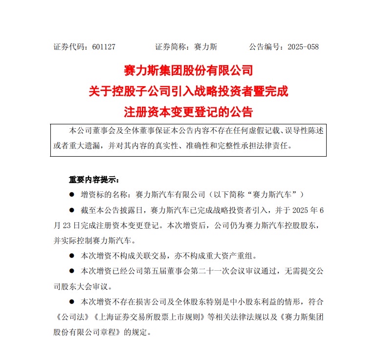 赛力斯集团股份有限公司表示,增资有利于增强赛力斯汽车资本实力,助力战略纵深布局,降低资产负债率,促进其可持续高质量发展,符合公司的发展战略规划和长远利益。