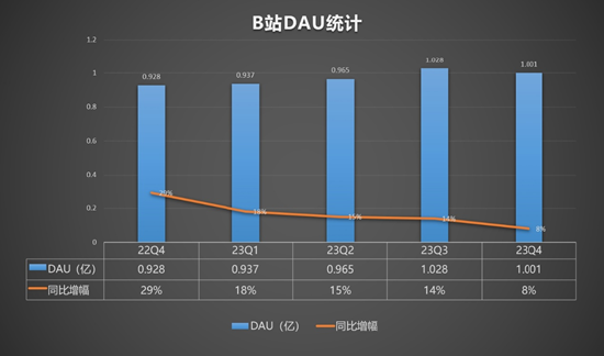 去年三季度,B站的DAU正式突破1亿大关,达到1.028亿,同比增长14%。不过,去年四季度,B站DAU为1.001亿,虽然同比保持8%的增长,但是环比却较三季度下滑了270万,去年四个季度DAU同比增幅更是持续下滑。