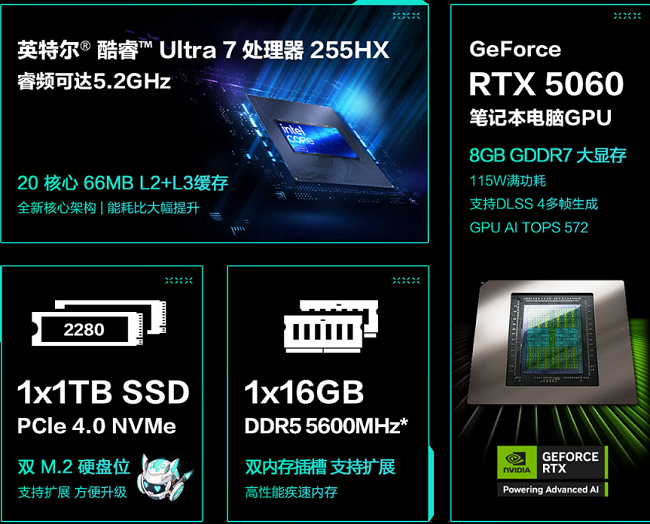 其他硬件配置上,华硕天选6 Pro采用英特尔酷睿Ultra 7 255HX处理器,20核20线程睿频5.2GHz,搭配16GB DDR5内存与1TB PCIe 4.0 SSD可实现各类应用与游戏流畅运行及切换,游戏时后台多开也不惧卡顿闪退。另外玩家还可以自行扩充内存与SSD,华硕天选6 Pro不仅预留有额外的内存和M.2固态插槽,还支持光感断电功能,开后盖自动断电,升级安全又便捷。
