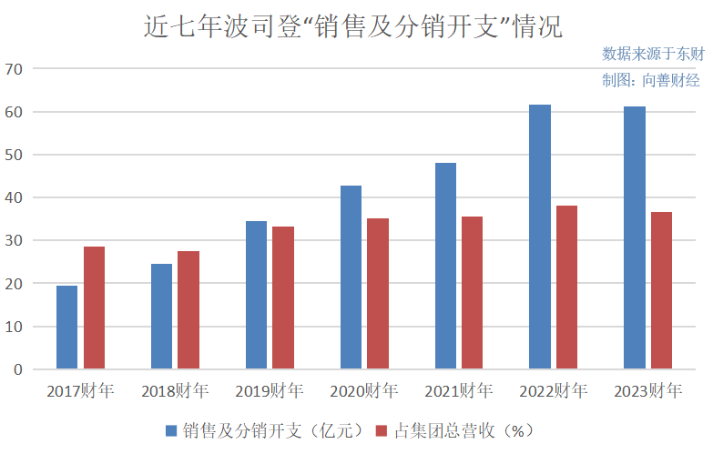 2017—2019—2023财年,波司登的销售及分销开支分别为19.51亿元、24.52亿元、34.4亿元、42.76亿元、48.07亿元、61.71亿元和61.25亿元,占集团总营收的28.62%、27.61%、33.14%、35.08%、35.55%、38.07%和36.52%。