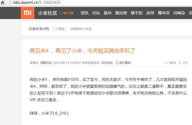 其实,质量问题也是很多小米用户抛弃小米的原因之一,曾经笔者也想购买小米手机,后来问了同事的小米使用感觉如何,同事给出的建议是经常坏,建议我不要购买。当然通过身边朋友的反馈并不能说小米手机的质量有问题,我们可以去小米社区看看,一篇“小米4c,买了后悔吗?”帖子,2万多浏览,近300的回复可以看出小米在硬件上的问题。当然还有“再见米4,再见了小米,今天起买其他手机了”的帖子,近1万的浏览量和200多回复,可以看出用户对小米手机的失望和抛弃。可以看用户的评论如下: