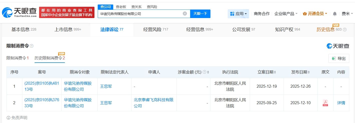 天眼查天眼风险信息显示,近日,华谊兄弟(300027)及法定代表人王忠军新增一则限制消费令,执行法院为北京市朝阳区人民法院,案件流程信息显示,此前,该公司已因此案被执行189万余元。