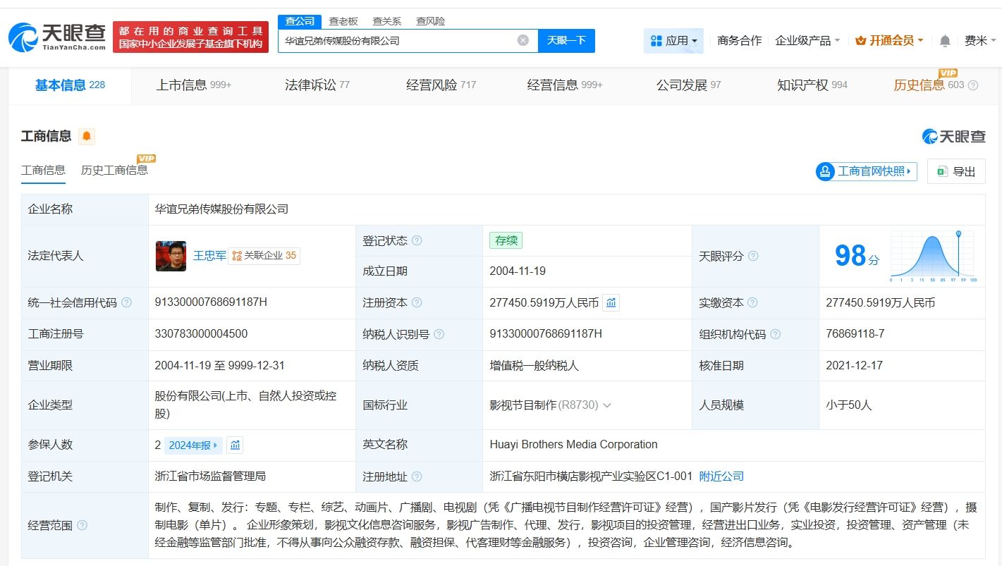 华谊兄弟传媒股份有限公司成立于2004年11月,注册资本约27.7亿人民币,经营范围包括企业形象策划、影视文化信息咨询服务、影视项目的投资管理等。股东信息显示,该公司由王忠军等共同持股。历史限制消费令信息显示,该公司曾被两次限消。