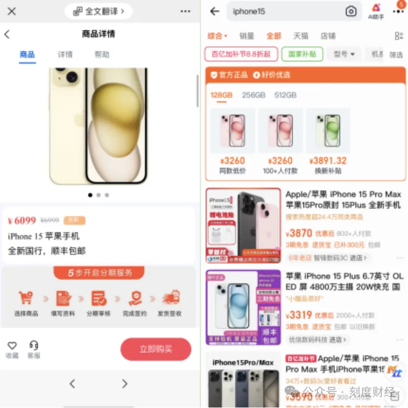 横向对比主流电商平台发现,同款美的冰箱在淘宝折后价不足1600元,宝酷商城标价却达4859元;iPhone 15 Pro淘宝价格基本为四千多,该商城标价8099元,近乎翻倍;iPhone 15标准版市场价目前基本在四千元以下,平台标价仍高达6099元。
