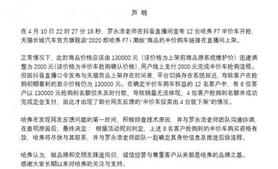 比如4月10日,罗永浩直播间上线了12台半价哈弗汽车链接,但只成交4台,链接就下架了。后面给出的解释是系统问题,导致8名用户抢到的是原价,放弃了付款。