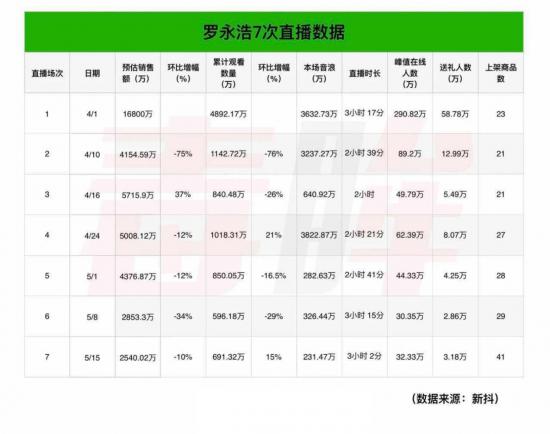 第三、从带货成绩来看,根据“新抖”数据,罗永浩首场直播成交1.68亿,第2到第5场的成交额在4000~5000万左右,第6~7场直播成交额已经下滑到2000多万。